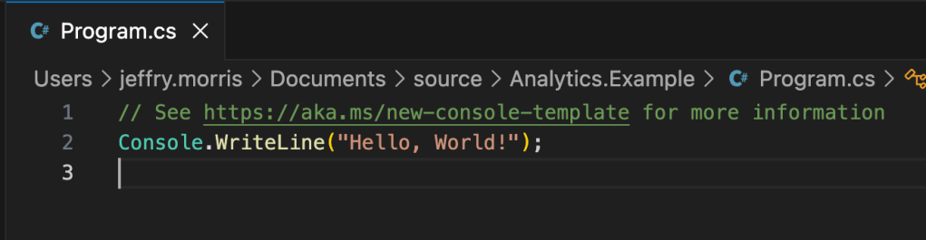 Using your favorite editor or IDE open the Program.cs file so that you can write some Analytics code:> code Program.cs